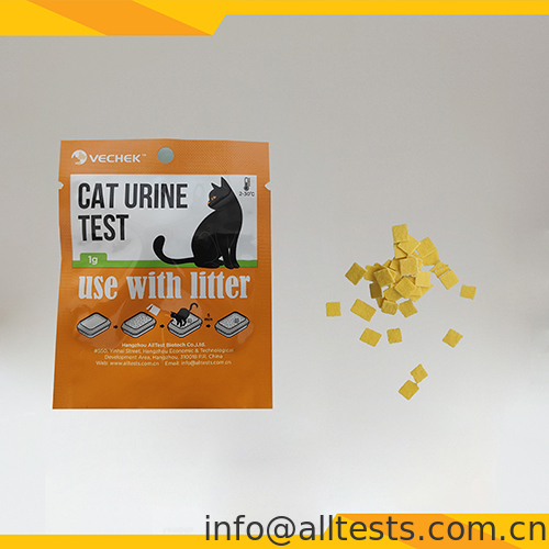3. Po oddaniu moczu przez kota, odczekaj 5 minut, obserwuj zmianę koloru mokrego obszaru moczu na żwirku dla kota.