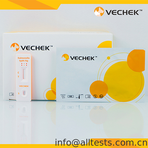 Kaseta do szybkiego testu na antygen Salmonella typhi (kał) jest testem jakościowym, opartym na metodzie immunochromatografii przepływu bocznego typu kanapkowego do wykrywania Salmonella typhi w próbkach kału zwierząt. W tym teście membrana jest wstępnie pokryta przeciwciałem anty-Salmonella typhi w obszarze linii testowej paska testowego. Podczas testowania próbka reaguje z cząsteczką pokrytą przeciwciałem anty-Salmonella typhi. Mieszanina przemieszcza się w górę membrany chromatograficznie poprzez działanie kapilarne, aby zareagować z przeciwciałem anty-Salmonella typhi na membranie i wytworzyć kolorową linię w obszarze linii testowej. Obecność tej kolorowej linii w obszarze testowym wskazuje wynik pozytywny, podczas gdy jej brak wskazuje wynik negatywny. Aby służyć jako kontrola proceduralna, kolorowa linia zawsze pojawi się w obszarze linii kontrolnej, wskazując, że dodano odpowiednią objętość próbki i nastąpiło wchłanianie membrany.